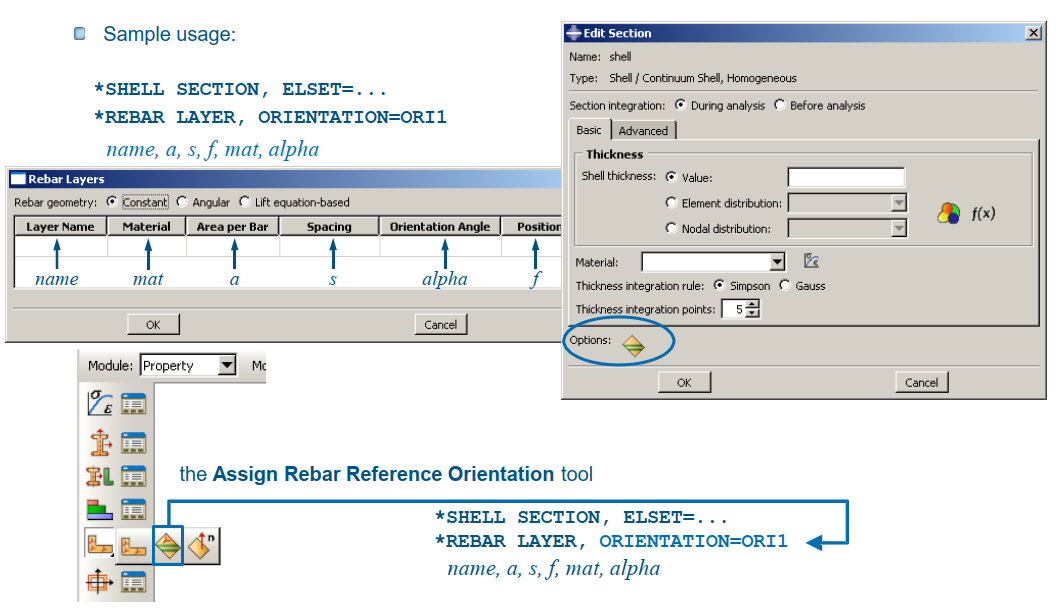 需要注意的items: 1. \(a\),rebar的横截面积 2. \(s\),rebar之间的间隔距离 3. \(f\),rebar相对于shell 单元中面的距离(在厚度方向上)